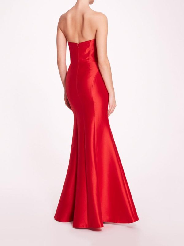 Step into a fairytale with the Floral Mikado Gown, a blend of timeless elegance and whimsical charm. Crafted from silk mikado, this strapless mermaid gown features cascading 3-D flower appliqués, creating a captivating, romantic silhouette.