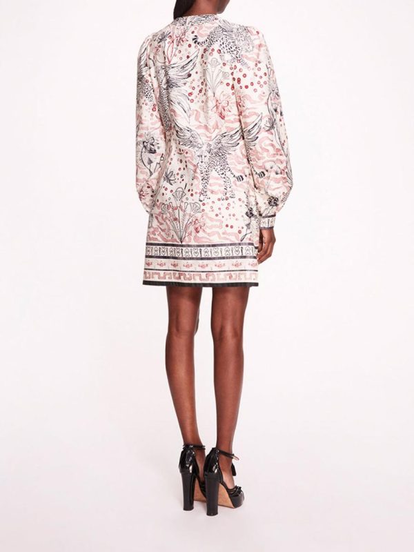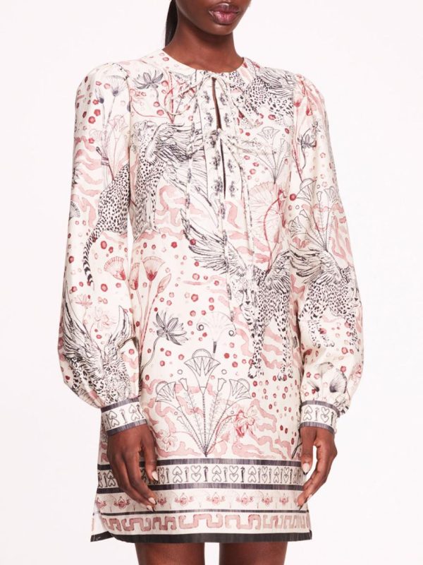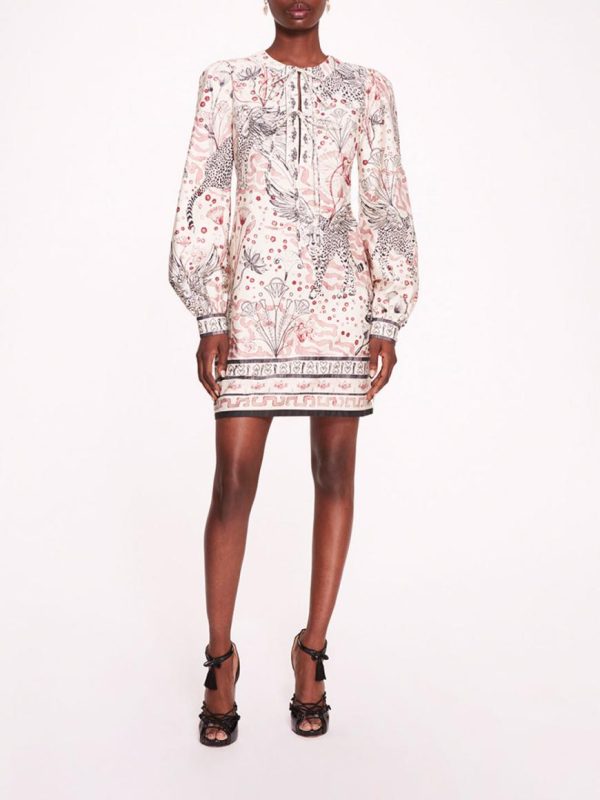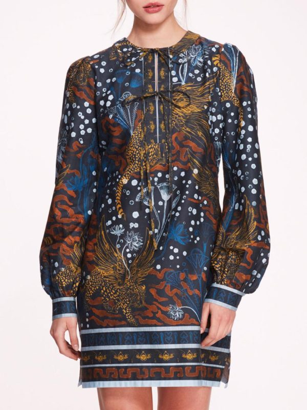 The Flying Cheetah Mini Dress features an a-line shift silhouette, charming front ties, and billowy cuffed sleeves. Crafted from poplin printed with winged leopards and abstract watercolor animal print, the mini dress exudes an adventurous spirit.