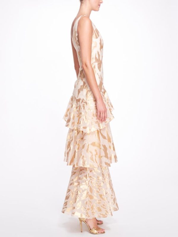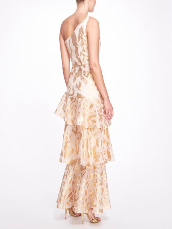 Women Gold One Shoulder Ruffled Tiered Gown | Marchesa Gowns
