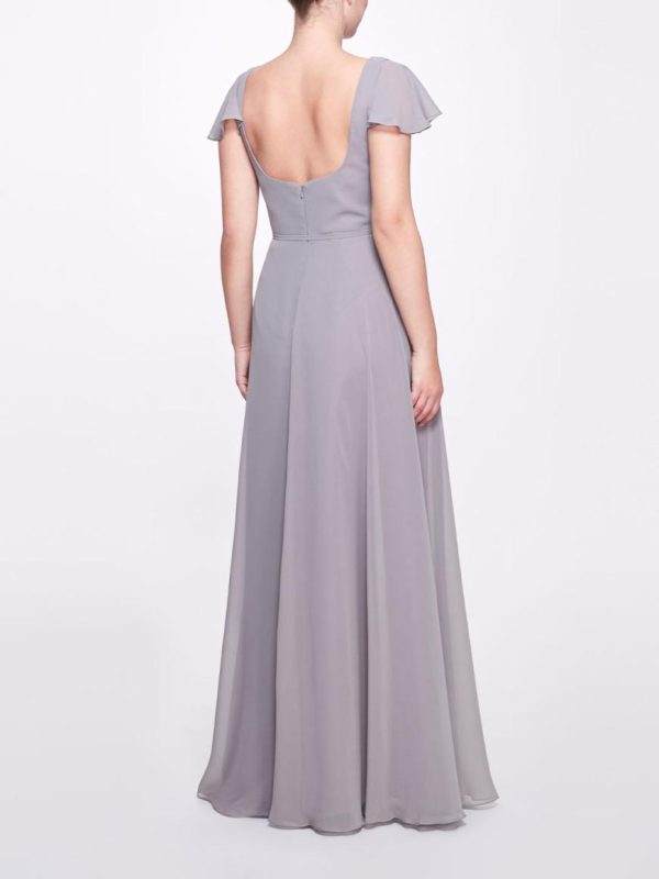 The Teramo gown in gunmetal is stunning sophistication. Featuring a ruffle sleeve, a U-neckline, and a tie around the waist, this gown encompasses elegance.