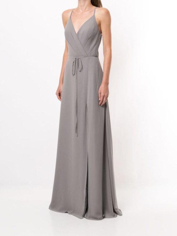 The Sessa gown in gunmetal blurs the line between geometric and organic shapes. The v-neck drape halter gown features a triangular cutout on the back, a single mid-thigh leg slit, and finished with an elongated waist tie to give notice to the natural curve of your figure.