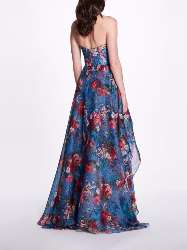 The embodiment of romance, this high-low gown in blue features a strapless sweetheart neckline, an A-line silhouette, and tropical and floral printed fabric.