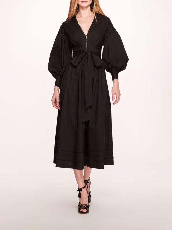 The Indigo Midi Dress is boldly constructed, featuring a zippered v-neckline and billowy cuffed sleeve. Crafted with cotton poplin, the a-line dress is complete with a bow tie at the waist.