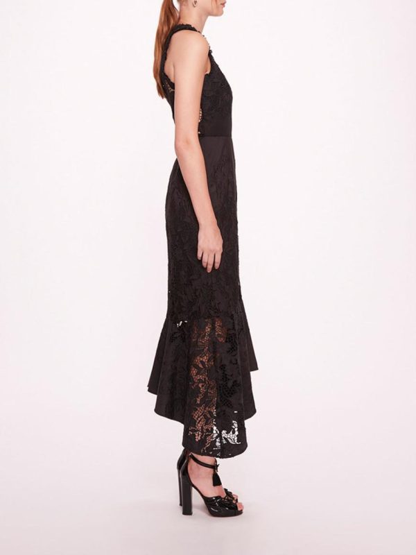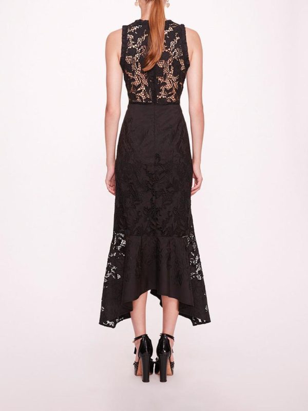 The Iris dress is a sleeveless fit-to-flare handkerchief lace midi dress.