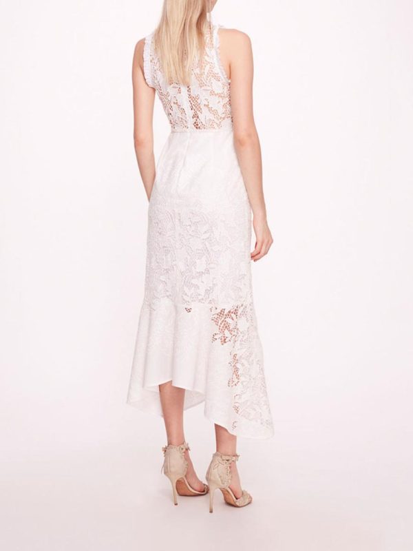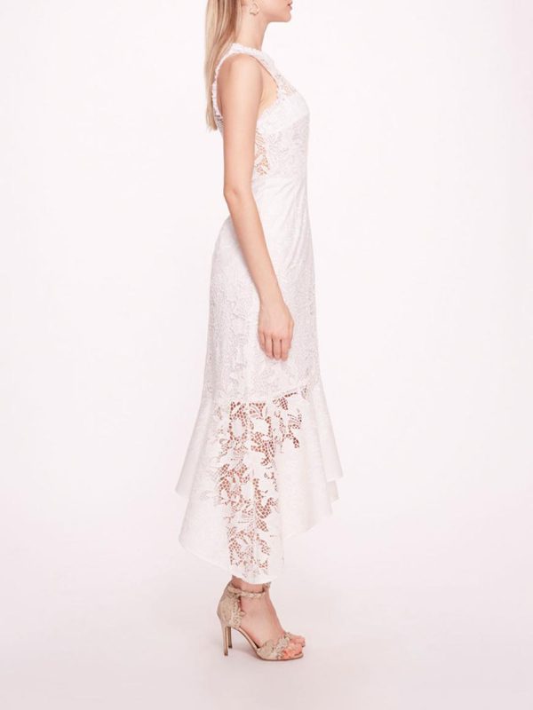The Iris dress is a sleeveless fit-to-flare handkerchief lace midi dress.