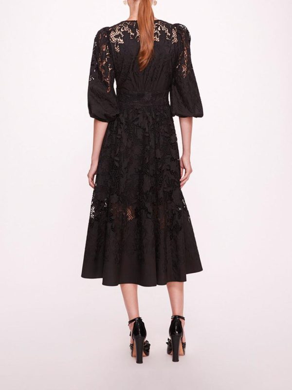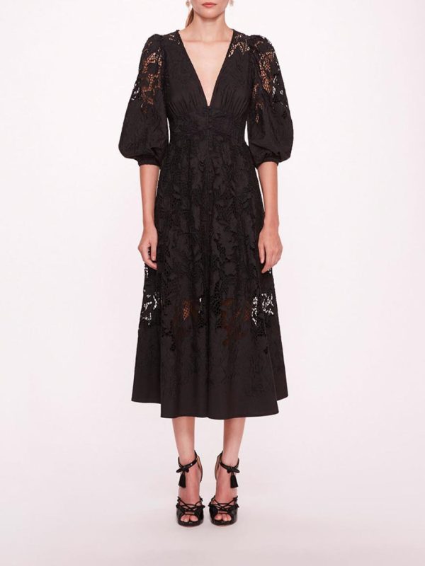 The Jessamine dress is a deep v-neck cotton guipure lace midi dress with ¾ sleeves.