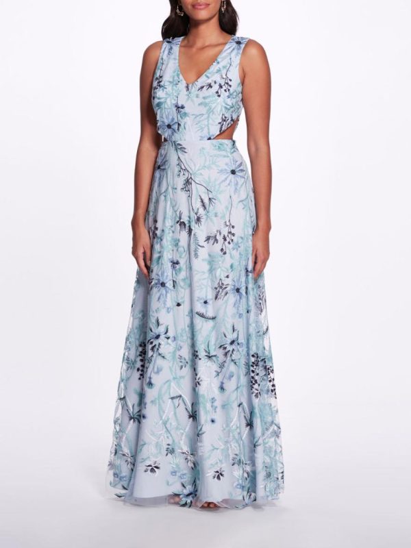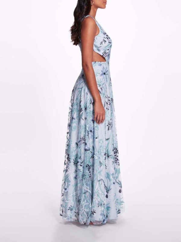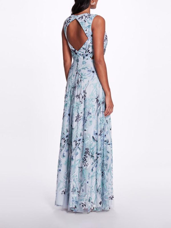 The definition of charm, this floor-length gown in slate blue features a sleeveless deep v-neckline, a keyhole back detail, and a bodice cut-out detail.