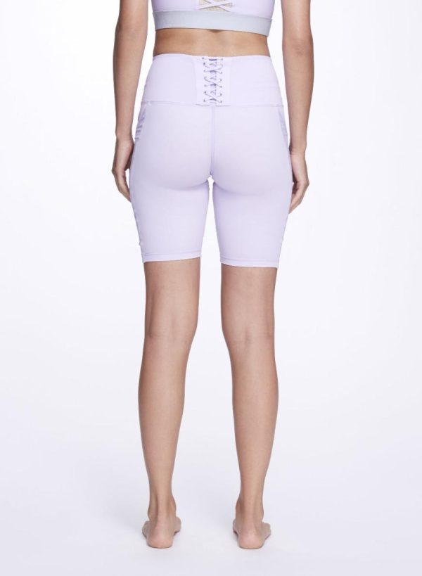 The Ashlyn Short is a lavender high waisted and knee length short featuring fun lace-up back detailing and power mesh sheer slit pocket details on the sides. These details combined with the compression fit and super smooth performance fabric make these shorts perfect for wearing anywhere and everywhere!