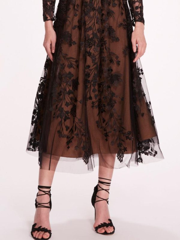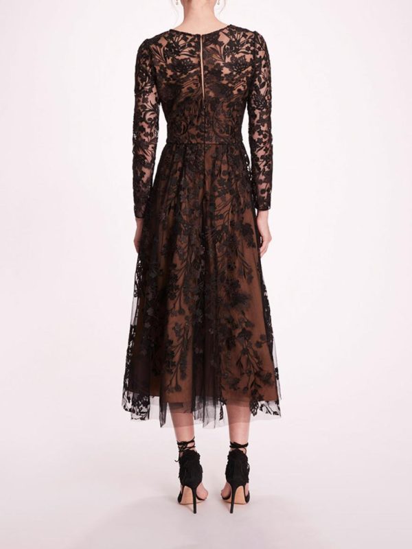 Step into sophistication with the Long Sleeve Tulle Midi Dress. Featuring delicate embroidery on sheer tulle, a fitted bodice, and a flounce skirt, this enchanting piece effortlessly balances elegance with flair.