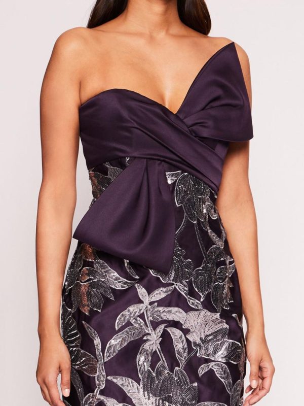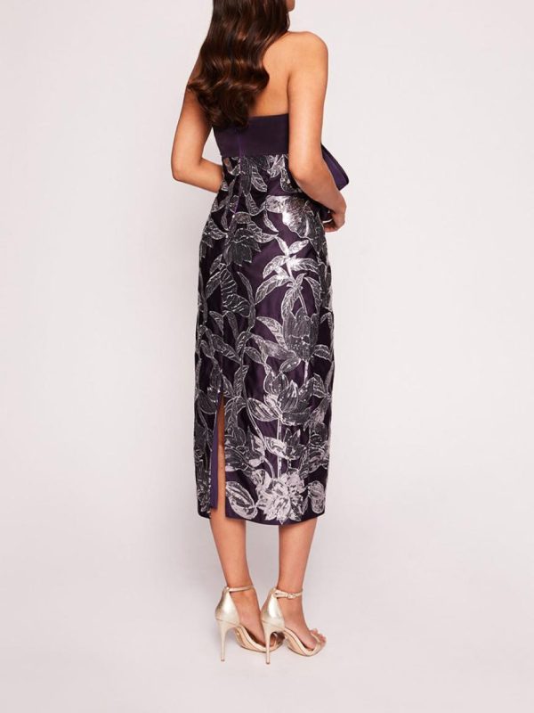 The Lotus Sequin Midi Dress is constructed with duchess satin and adorned with lotus sequin work. The pencil cocktail dress features a diagonal bow twist detail on the bodice and slit at the back of the skirt.