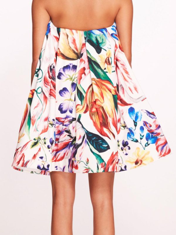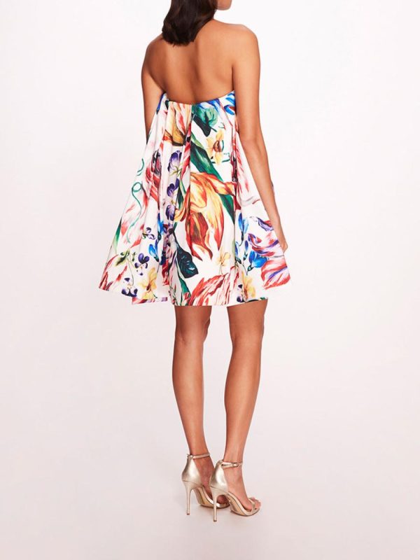 The Mikado Mini Dress is a mini sleeveless sweetheart dress with a cape on floral print Mikado fabric.