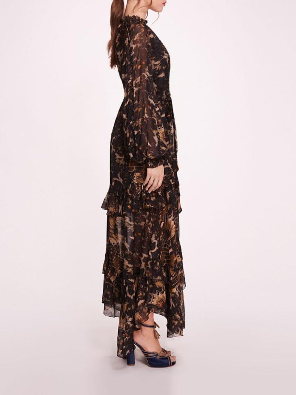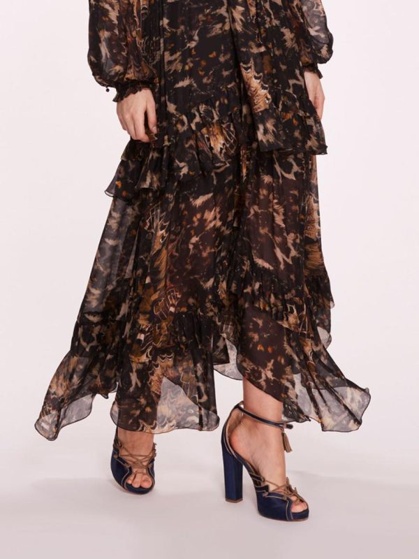 The Monarch Maxi Dress is an abstract embodiment of the butterfly. Crafted with printed silk viscose fabric, its raglan billowy sleeves adorned with bobble button accents exude a sense of refinement, while the flowy A-line silhouette and handkerchief hem create a captivating sense of movement. Complete with a separate belt, this dress offers versatility in styling.
