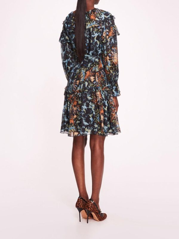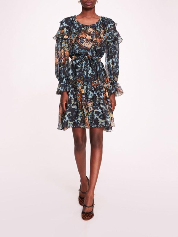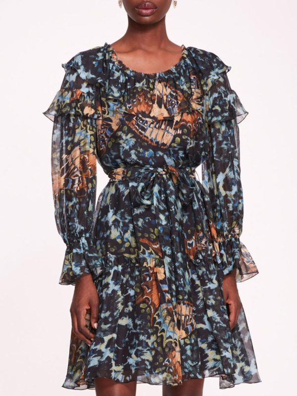 The Monarch Mini Dress is a whimsical statement piece, crafted with an abstract butterfly print on silk viscose fabric. Its a-line silhouette, billowy sleeves, and delicate ruffle details exude playful charm and feminine grace. Complete with bobble buttons and a separate belt, this dress offers versatility in styling while captivating attention with its elegant scoop neckline.