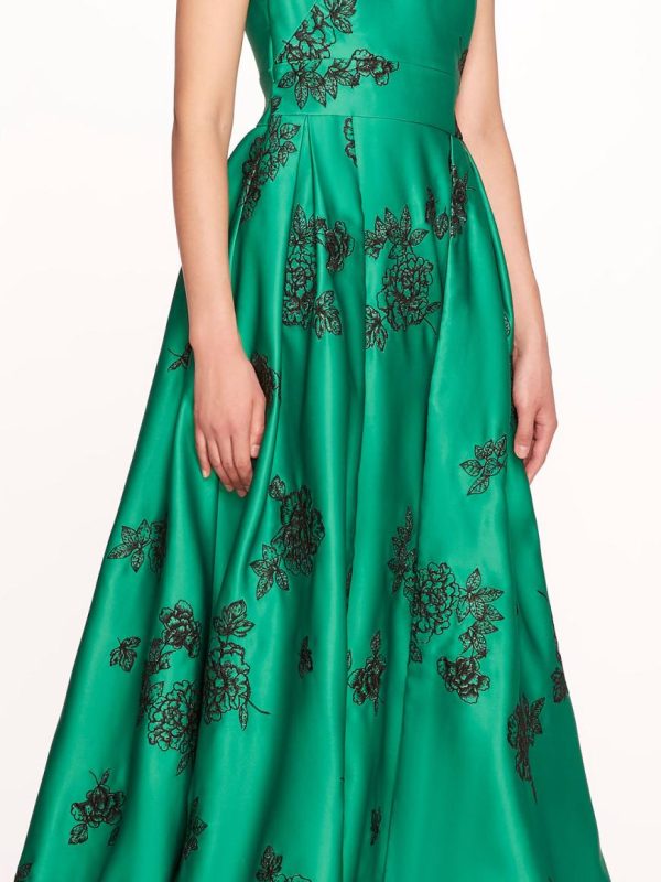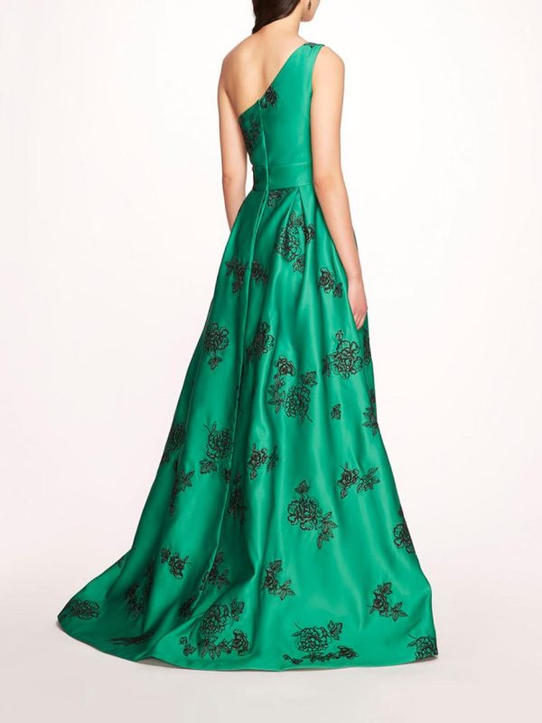 Crafted with heavy duchess satin, the One Shoulder Marigold Ball Gown is a column gown featuring a one shoulder neckline and voluminous overskirt. Scattered marigolds make for an exceptionally decadent feel.