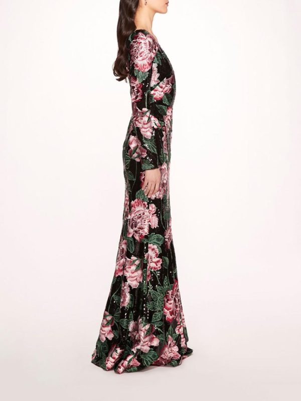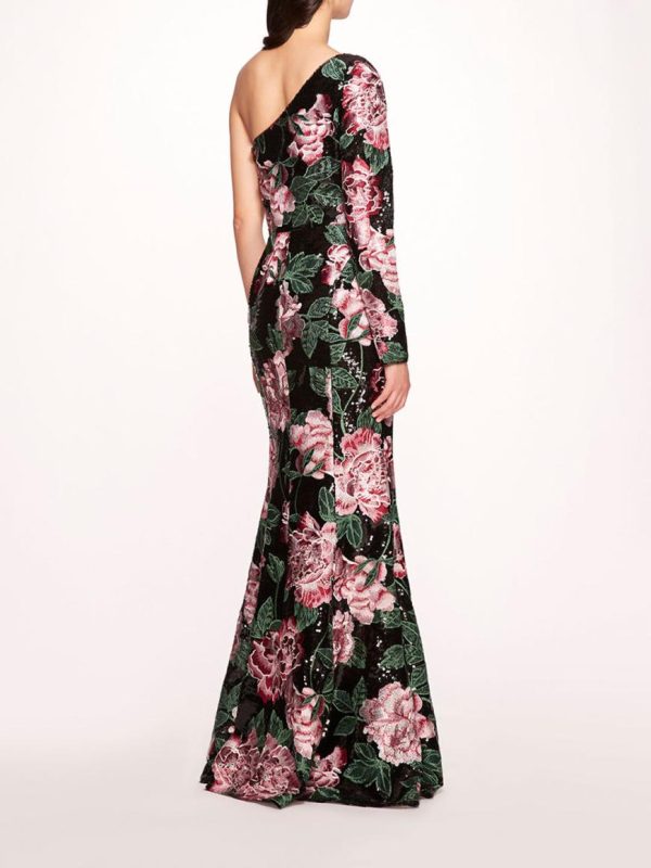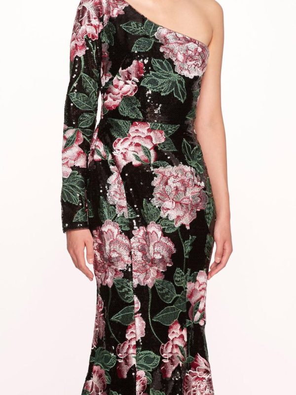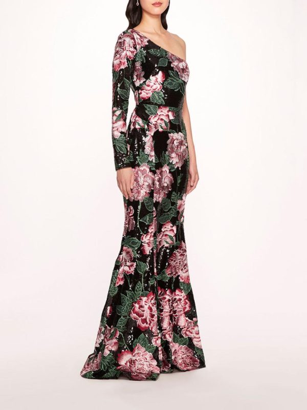 The One Shoulder Sequin Gown is crafted with shiny degournay garland sequin fabric. Detailed with multi thread embroidery, the fit to flare gown features a one shoulder neckline and long sleeve.