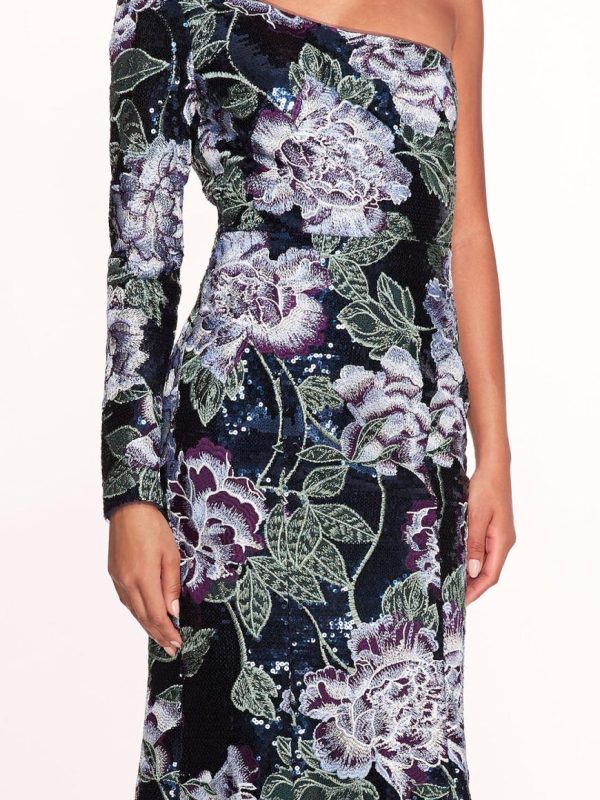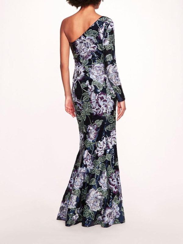 The One Shoulder Sequin Gown is crafted with shiny degournay garland sequin fabric. Detailed with multi thread embroidery, the fit to flare gown features a one shoulder neckline and long sleeve.