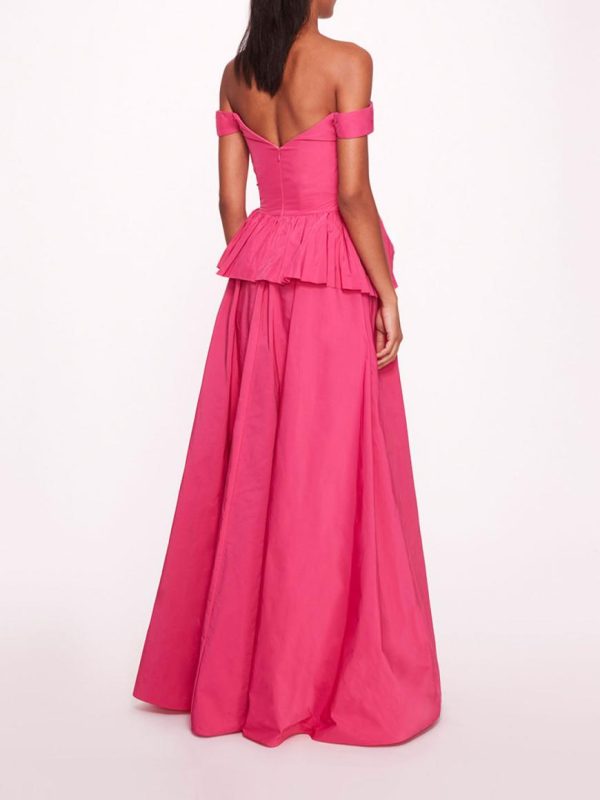The Peplum Taffeta Gown is an off-shoulder taffeta ballgown featuring a draped bodice, ball-gown skirt with peplum, and front side slit.