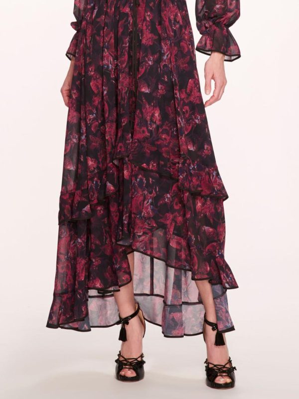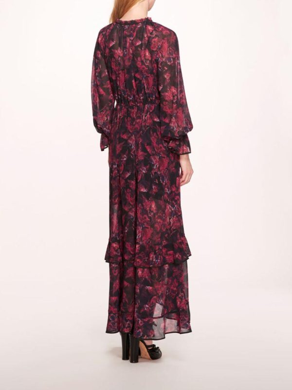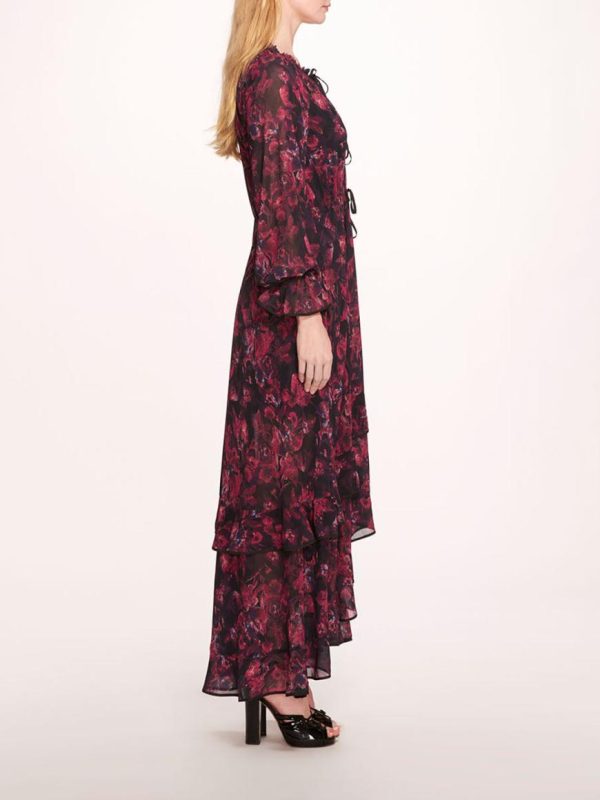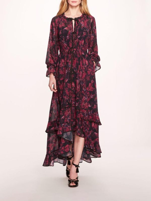 The Pom Maxi Dress is crafted with georgette fabric and features a tie neckline, long sleeve, and ruffle details at the hem. Complete with billowy sleeves, Pom is romantic and functional.