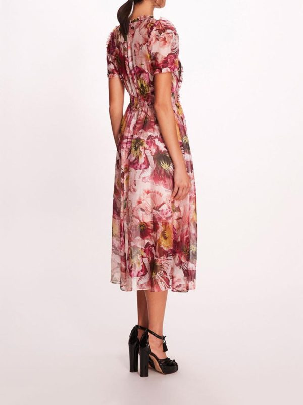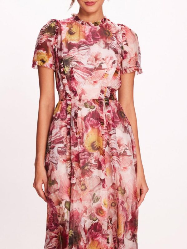The Sedum Dress is a midi a-line dress featuring a mock neckline and ruffled short sleeve. Sedum is crafted with silk viscose and completed with smocking details at the waist.