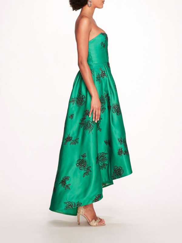 Crafted with heavy duchess satin, the Strapless Marigold Gown is a high low a-line gown featuring a sweetheart neckline and pockets at the hip. Scattered marigolds make for an exceptionally decadent feel.