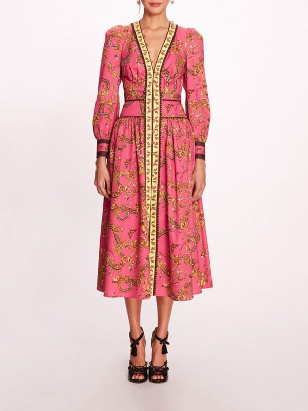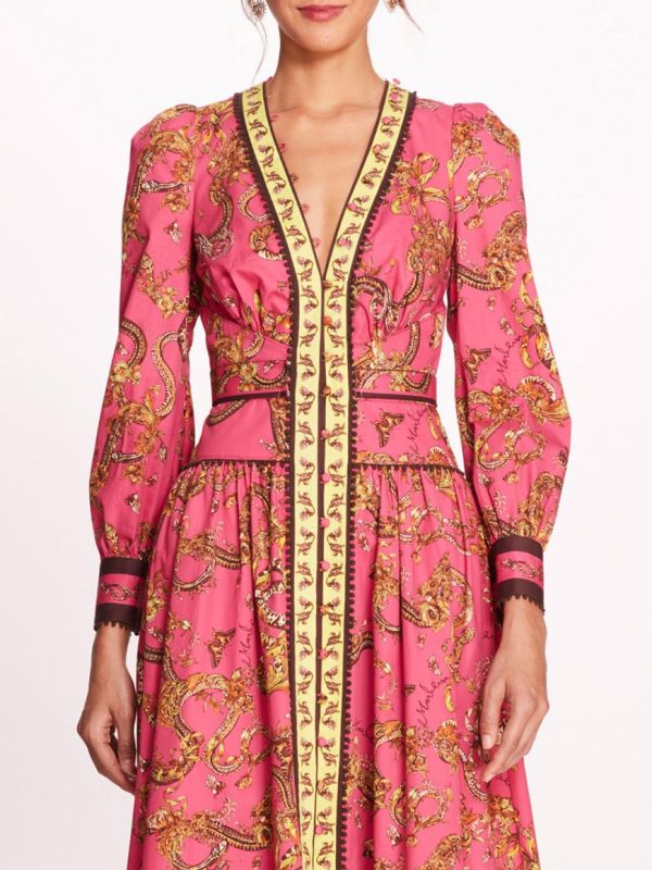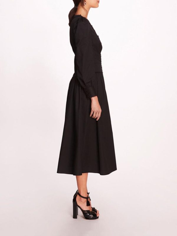 The Tansy Midi Dress is an a-line dress featuring a v-neckline, bishop long sleeve, and smocked back. Tansy is crafted with printed cotton poplin and completed with cuffed sleeves, bobble trim detail, and waistband stitching.