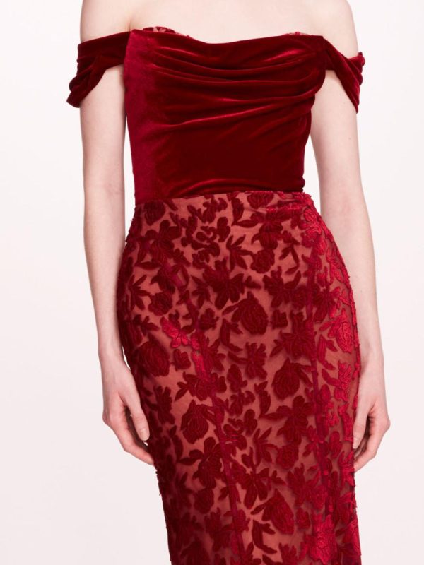 Elevate your evening style with the Velvet Cutwork Midi Dress, featuring a chic off-the-shoulder design and a flattering sweetheart neckline. The velvet cutouts add a touch of allure, while the solid velvet ruched bodice enhances your silhouette for a stunning effect.